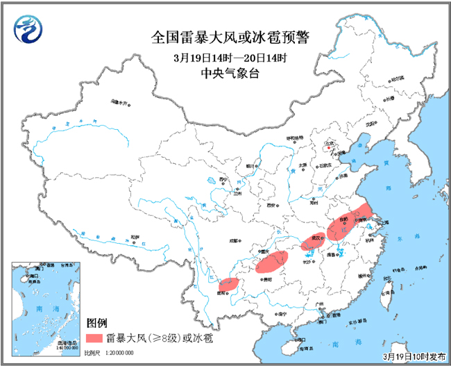 這次降雨過程中,會有明顯的雷電天氣。從19日夜間開始,河南南部、江蘇、安徽東北部、湖北北部、湖南西北部和貴州北部等地將先后出現(xiàn)雷電、短時強(qiáng)降水、雷暴大風(fēng)和冰雹等強(qiáng)對流天氣。19日10時,中央氣象臺發(fā)布了強(qiáng)對流天氣藍(lán)色預(yù)警。