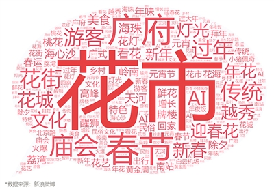 今年春節(jié),廣州首次推出智慧AI花市,花市、燈光、花燈等成了新年熱詞。圖為廣州新年詞頻示意圖。