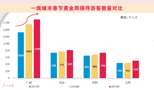 2019年春節(jié),廣州創(chuàng)下游客接待量和旅游業(yè)總收入“雙新高”,共接待旅客1696.27萬(wàn)人次,較2018年同期增長(zhǎng)8.66%,高于北京的811.70萬(wàn)人次、上海的509.20萬(wàn)人次,居一線城市首位,分別是北京的兩倍和上海的三倍;旅游業(yè)創(chuàng)收122億元,實(shí)現(xiàn)9.74%的增長(zhǎng),高于北京的81.85億元和上海的66.20億元,分別是北京的1.5倍和上海的1.8倍。
