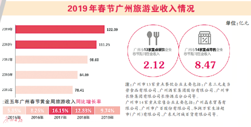 自2015年以來(lái),廣州春節(jié)黃金周旅游總收入逐年攀升。2018年突破百億大關(guān),今年再創(chuàng)新高。大批旅客的到來(lái)帶動(dòng)廣州與旅游相關(guān)的餐飲、零售等行業(yè)的持續(xù)旺盛。