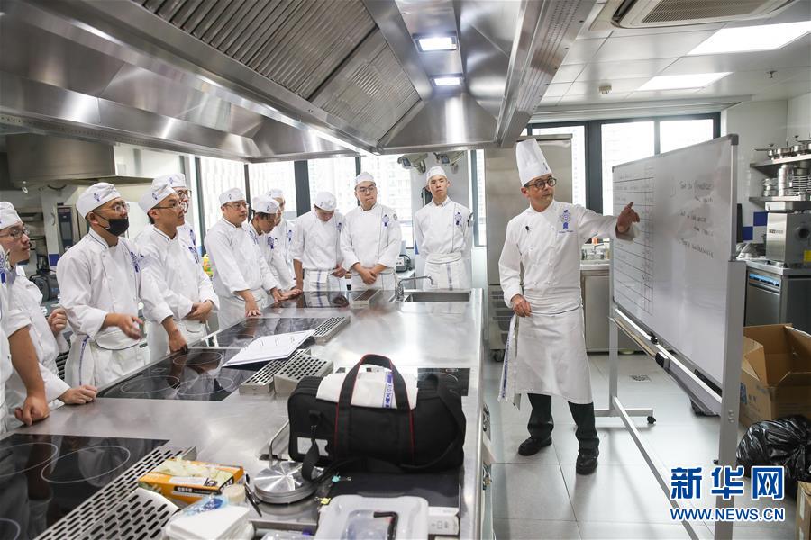 這是2018年10月17日, 來(lái)自法國(guó)的菲利普(右)在上海藍(lán)帶廚藝職業(yè)技能培訓(xùn)學(xué)校的教室內(nèi)給學(xué)員們教授法式廚藝。 新華社記者 丁汀 攝