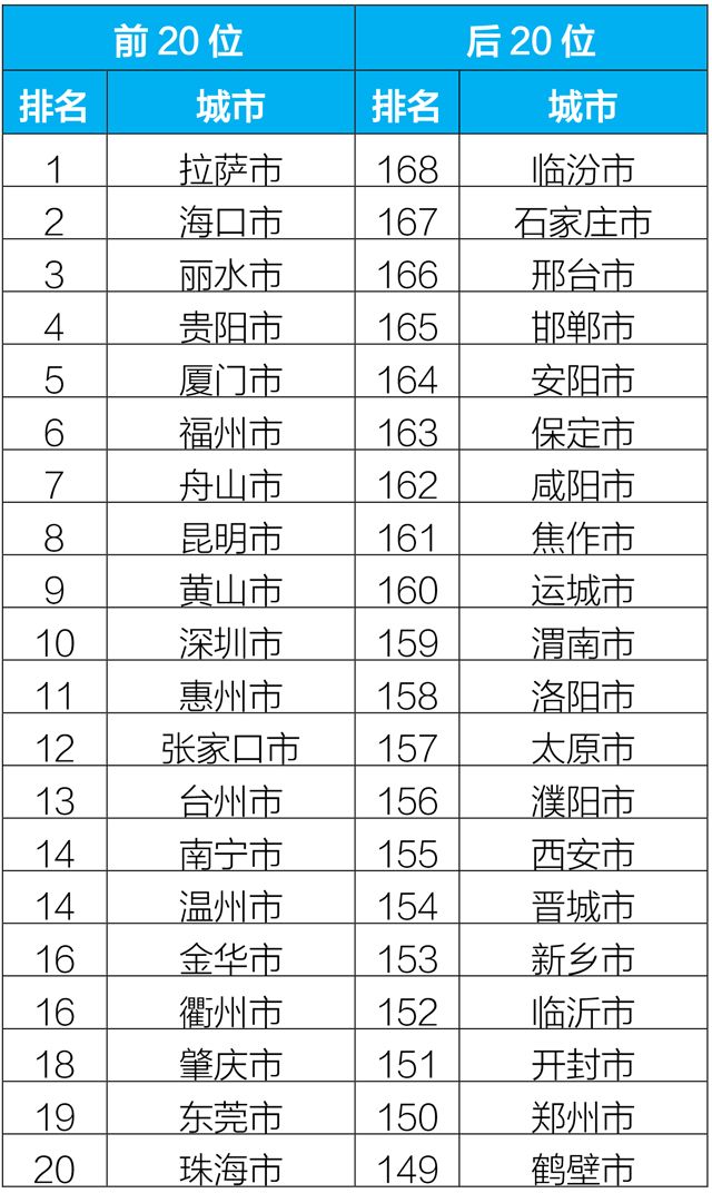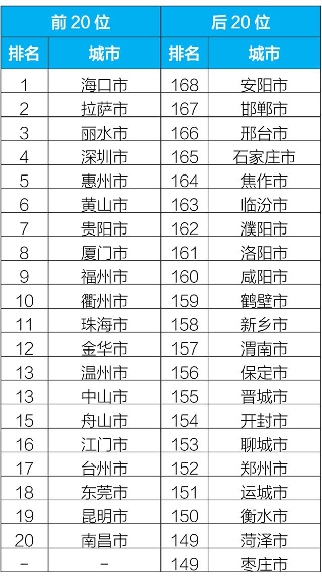 2019年2月,168個重點城市中安陽、邯鄲、邢臺市等21個城市空氣質(zhì)量相對較差(從第168名到并列第149名);??凇⒗_、麗水市等20個城市空氣質(zhì)量相對較好。