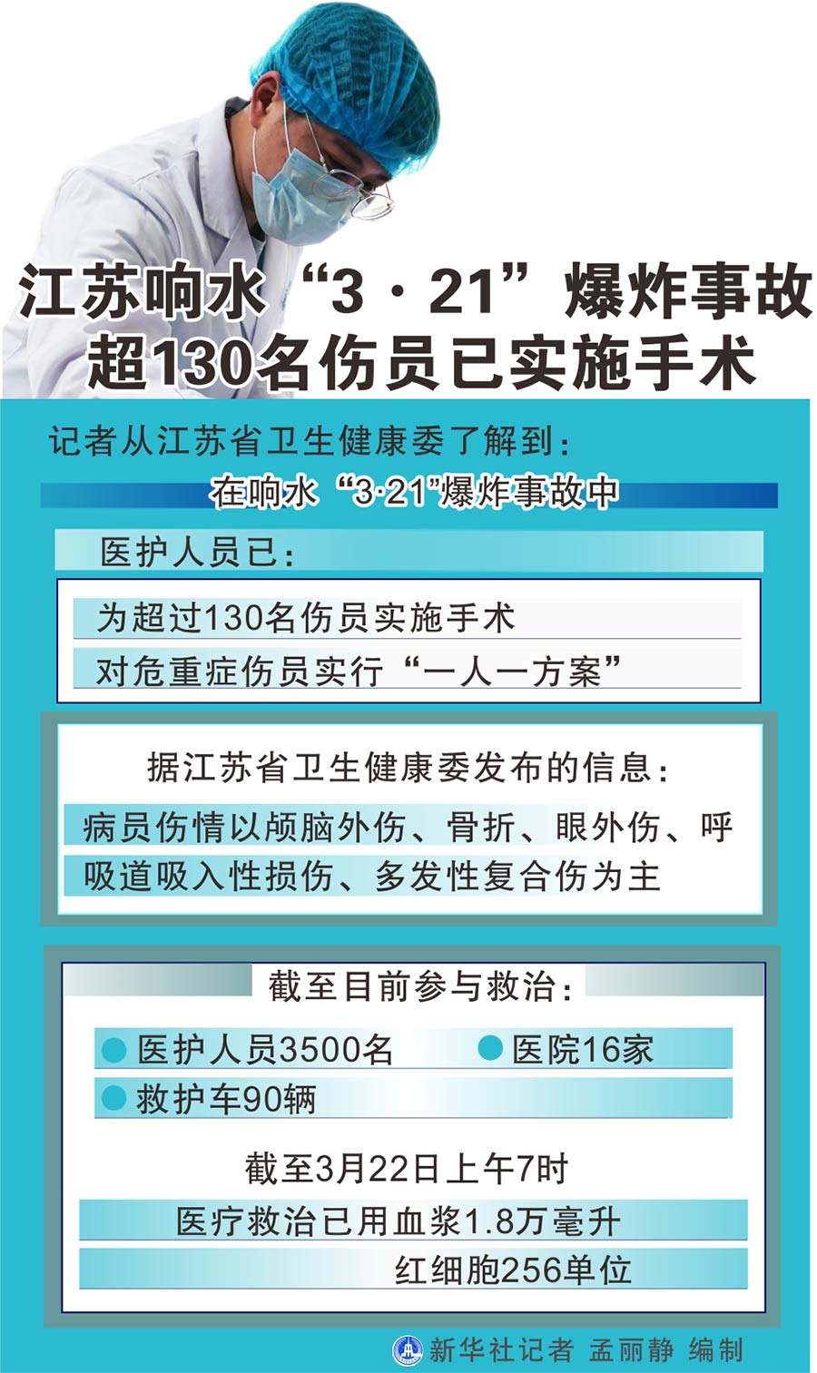 圖表:江蘇響水“3·21”爆炸事故超130名傷員已實施手術(shù) 新華社記者 孟麗靜 編制
