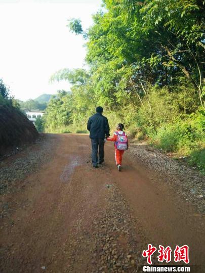 愛(ài)心志愿者康雄牽著“事實(shí)孤兒”去上學(xué)的背景?!¢L(zhǎng)沙市岳麓區(qū)大愛(ài)無(wú)疆公益文化促進(jìn)會(huì)供圖 攝