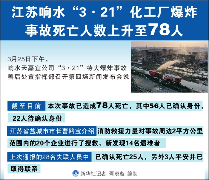 新華社響水3月25日電(記者朱國亮)25日下午,響水天嘉宜公司“3·21”特大爆炸事故善后處置指揮部召開第四場(chǎng)新聞發(fā)布會(huì)說,截至目前,本次事故死亡人數(shù)上升至78人。