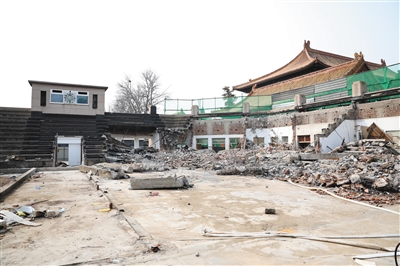太廟曾是明清兩代皇帝祭奠祖先的家廟,因維護(hù)管理需要,曾在上世紀(jì)五六十年代建設(shè)過(guò)一些臨時(shí)建筑物,其中就有一處占地1600余平方米的廢棄看臺(tái)及附屬建筑物,由于歷史原因一直沒(méi)有將其拆除。經(jīng)多方協(xié)調(diào),3月20日上午東城城管東華門街道執(zhí)法一隊(duì)開(kāi)始對(duì)該處有將近60年的“臨建”進(jìn)行了拆除。