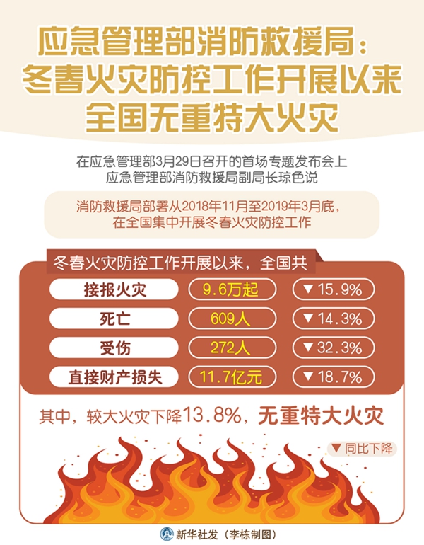 新華社北京3月29日電(記者葉昊鳴)“冬春火災(zāi)防控工作開展以來,全國共接報(bào)火災(zāi)9.6萬起、亡609人、傷272人、直接財(cái)產(chǎn)損失11.7億元,四項(xiàng)指數(shù)同比分別下降15.9%、14.3%、32.3%和18.7%。其中,較大火災(zāi)下降13.8%,無重特大火災(zāi)?!睉?yīng)急管理部消防救援局副局長瓊色說。