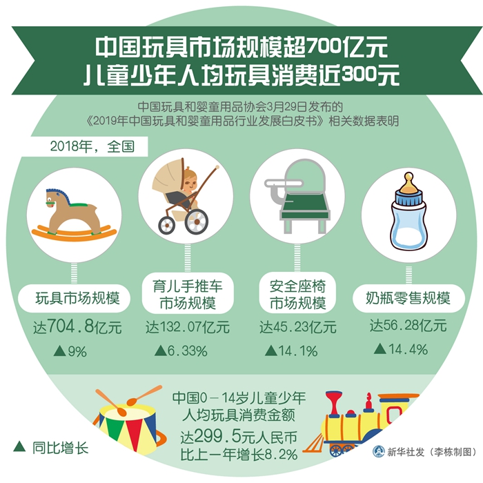 新華社上海3月29日電(記者 吳宇)2018年,中國0-14歲兒童少年人均玩具消費金額達(dá)299.5元人民幣,比上一年增長8.2%;2019年,中國65.6%的消費者計劃增加玩具消費支出,63.9%的消費者計劃增加嬰童用品消費支出。