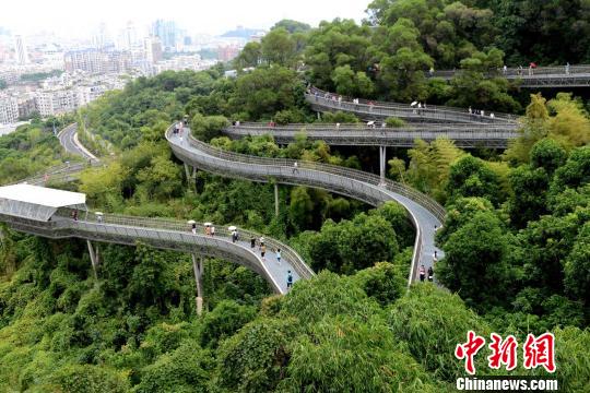 福州市園林局工作人員說,福州的城市綠道建設結合串珠公園建設、內河治理,使市民和游客能享有登山看城、游園親水的“一站式”體驗,其中“福道”成為了福州這個“山水”城市特有的“名片”。