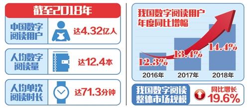 4月12日至14日,第五屆中國數(shù)字閱讀大會在杭州召開。會上發(fā)布的《2018年度中國數(shù)字閱讀白皮書》顯示,截至2018年,中國數(shù)字閱讀用戶總量達(dá)到4.32億,人均數(shù)字閱讀量達(dá)到12.4本,人均單次閱讀時長達(dá)71.3分鐘。我國數(shù)字閱讀整體市場規(guī)模已達(dá)到254.5億元,同比增長19.6%,大眾閱讀市場規(guī)模占比逾九成,是產(chǎn)業(yè)發(fā)展主導(dǎo)力量。