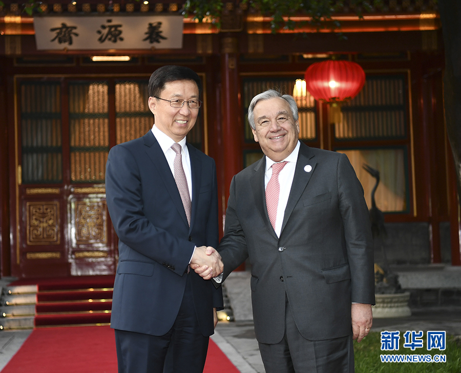 4月27日,中共中央政治局常委、國務(wù)院副總理韓正在北京釣魚臺(tái)國賓館會(huì)見聯(lián)合國秘書長(zhǎng)古特雷斯。新華社記者 謝環(huán)馳 攝