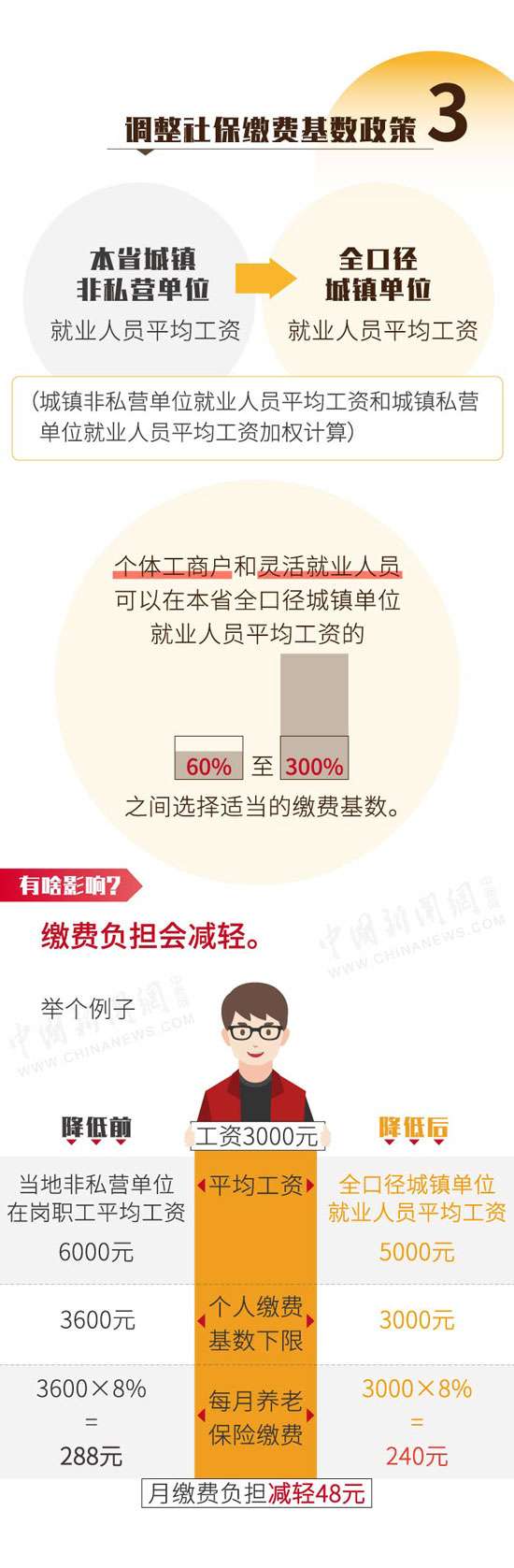 另一個含金量比較高的政策就是調(diào)整社保繳費基數(shù)。改用全口徑城鎮(zhèn)單位就業(yè)人員平均工資來核定個人繳費基數(shù)上下限,比原政策規(guī)定的非私營單位在崗職工平均工資,能夠更合理地反映參保人員實際平均工資水平,部分工資水平較低的職工和企業(yè)繳費基數(shù)可相應(yīng)降低,繳費負擔會減輕。