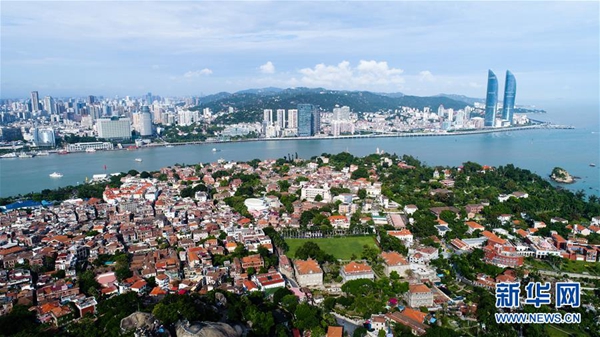 這是鳥(niǎo)瞰廈門鼓浪嶼和廈門島(2017年8月24日攝)。新華社記者 王建華 攝