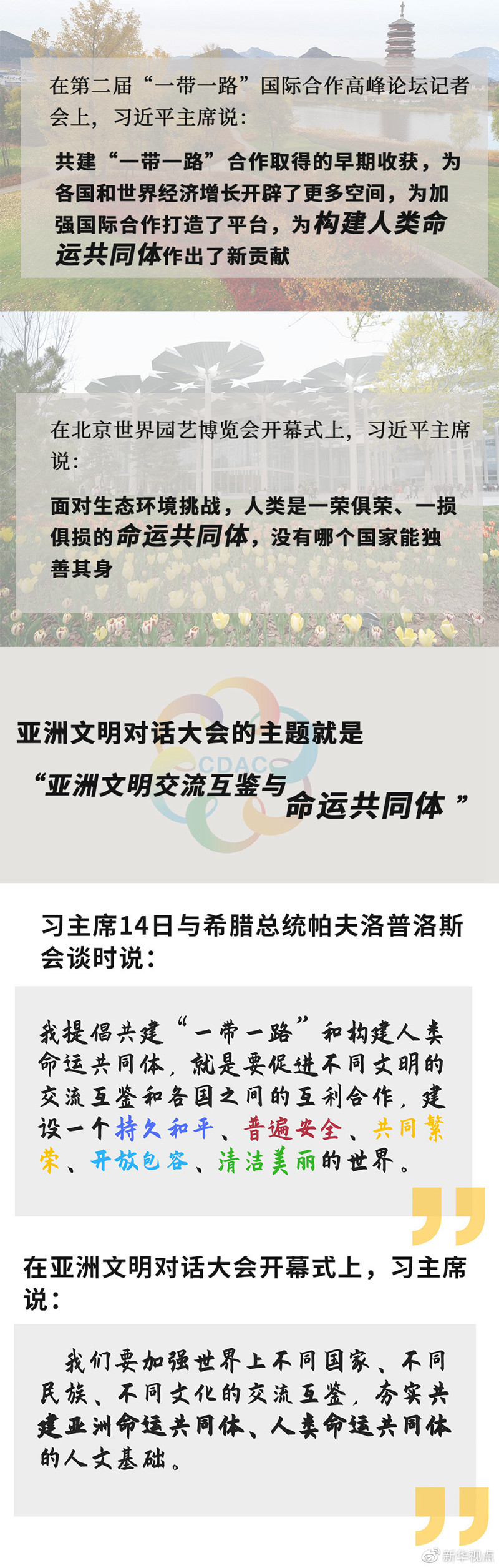 半個多月來,世界的目光一次次聚焦北京。從第二屆“一帶一路”國際合作高峰論壇,到2019年中國北京世界園藝博覽會,再到亞洲文明對話大會,三場活動主題不同,卻有一個關(guān)鍵詞貫穿始終:命運共同體。
