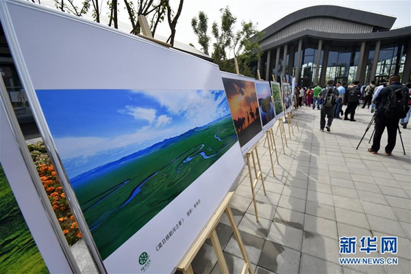在北京世園會(huì)“內(nèi)蒙古日”文化展示活動(dòng)上展出的呼倫貝爾風(fēng)光攝影作品(5月17日攝)。新華社記者 李欣 攝