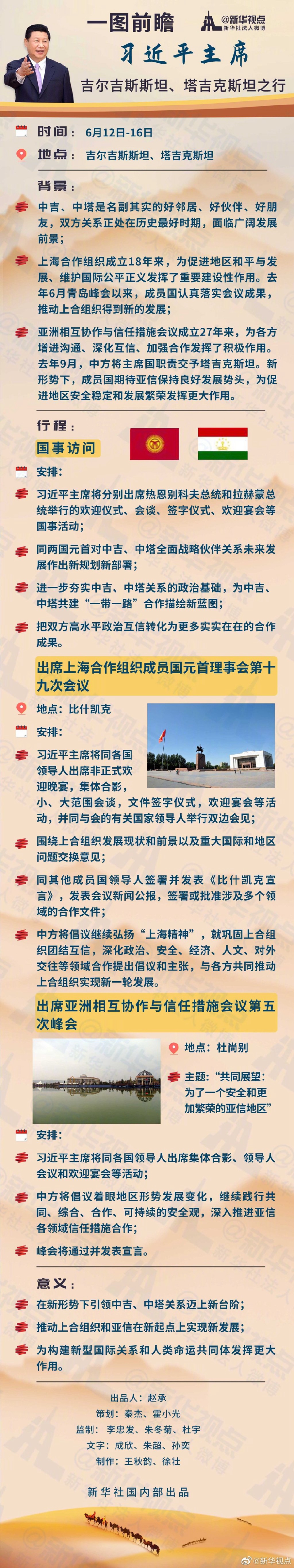 習(xí)近平主席將于6月12日至16日對(duì)吉爾吉斯斯坦、塔吉克斯坦進(jìn)行國(guó)事訪問(wèn)并出席在比什凱克舉行的上海合作組織成員國(guó)元首理事會(huì)第十九次會(huì)議和在杜尚別舉行的亞洲相互協(xié)作與信任措施會(huì)議第五次峰會(huì)。這次出訪有啥看點(diǎn)?戳圖秒懂??
