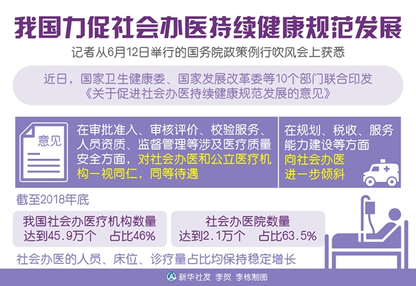 新華社北京6月12日電(記者張泉、屈婷)記者從12日舉行的國務(wù)院政策例行吹風(fēng)會上獲悉,近日,國家衛(wèi)生健康委、國家發(fā)展改革委等10個部門聯(lián)合印發(fā)《關(guān)于促進(jìn)社會辦醫(yī)持續(xù)健康規(guī)范發(fā)展的意見》,立足社會辦醫(yī)的定位和發(fā)展方向,在鞏固和加強(qiáng)前期工作的基礎(chǔ)上,又推出一批鼓勵支持政策。