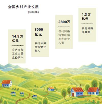 產(chǎn)業(yè)興旺是鄉(xiāng)村振興的基礎(chǔ),是解決農(nóng)村問題的前提。黨的十八大以來,鄉(xiāng)村產(chǎn)業(yè)呈現(xiàn)良好發(fā)展勢頭。2018年,糧食產(chǎn)能連續(xù)7年保持在1.2萬億斤以上,農(nóng)產(chǎn)品加工業(yè)主營業(yè)務(wù)收入達14.9萬億元,鄉(xiāng)村休閑旅游營業(yè)收入超過8000億元,農(nóng)業(yè)生產(chǎn)性服務(wù)業(yè)營業(yè)收入超過2000億元,農(nóng)村網(wǎng)絡(luò)銷售額1.3萬億元,返鄉(xiāng)下鄉(xiāng)創(chuàng)新創(chuàng)業(yè)人員累計達780萬。