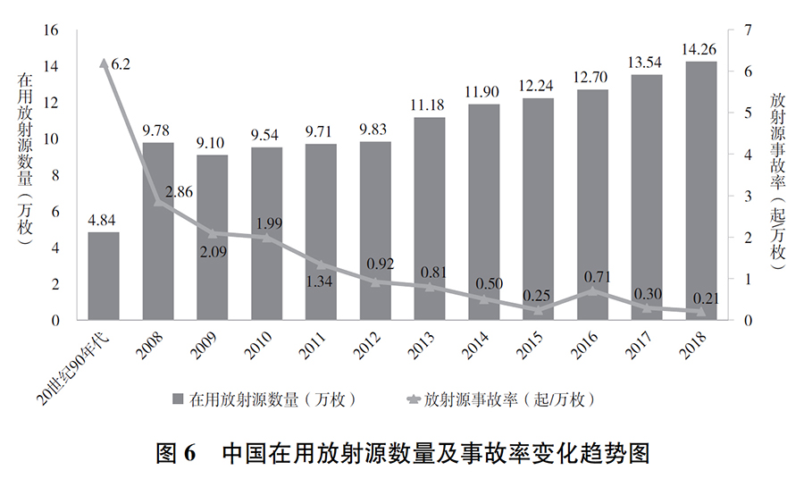 核技術(shù)利用安全水平大幅提升。對放射源實(shí)行從“搖籃”到“墳?zāi)埂钡娜^程動(dòng)態(tài)管理,將所有涉源單位納入政府監(jiān)管范圍,建立國家核技術(shù)利用管理數(shù)據(jù)庫,實(shí)施放射源安全提升行動(dòng),實(shí)現(xiàn)高風(fēng)險(xiǎn)移動(dòng)源在線實(shí)時(shí)監(jiān)控,提高核技術(shù)利用安全水平。截至2019年6月,中國在用放射源142607枚,各類射線裝置181293臺(tái)(套),從事生產(chǎn)、銷售、使用放射性同位素和射線裝置的單位共73070家,放射源和射線裝置100%納入許可管理,廢舊放射源100%安全收貯。放射源輻射事故年發(fā)生率持續(xù)降低,由20世紀(jì)90年代的每萬枚6.2起降至目前的每萬枚1.0起以下,達(dá)到歷史最低水平。