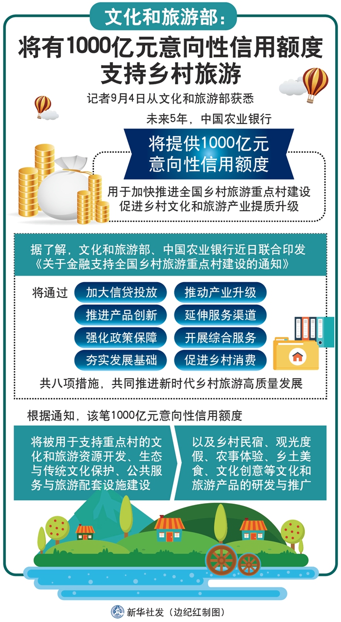 新華社北京9月4日電(記者余俊杰)記者4日從文化和旅游部獲悉,未來5年,中國農(nóng)業(yè)銀行將提供1000億元意向性信用額度,用于加快推進全國鄉(xiāng)村旅游重點村建設,促進鄉(xiāng)村文化和旅游產(chǎn)業(yè)提質(zhì)升級。