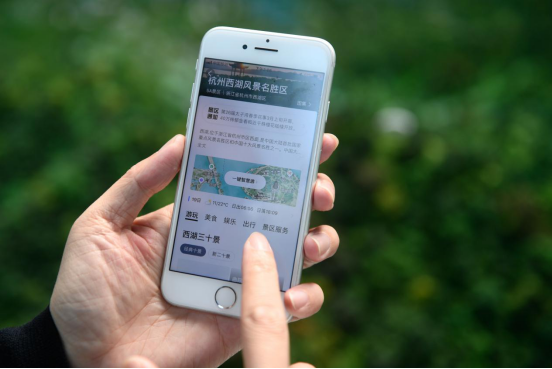 ↑2019年3月19日,游客使用手機體驗“西湖一鍵智慧游”服務(wù),可實現(xiàn)一鍵導(dǎo)航、一鍵導(dǎo)覽、一鍵導(dǎo)游。新華社記者 黃宗治 攝