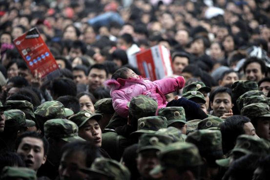 ↑2008年2月1日,武警戰(zhàn)士從廣州火車站密密麻麻的人群中把一個孩子手遞手托舉出來。新華社發(fā)