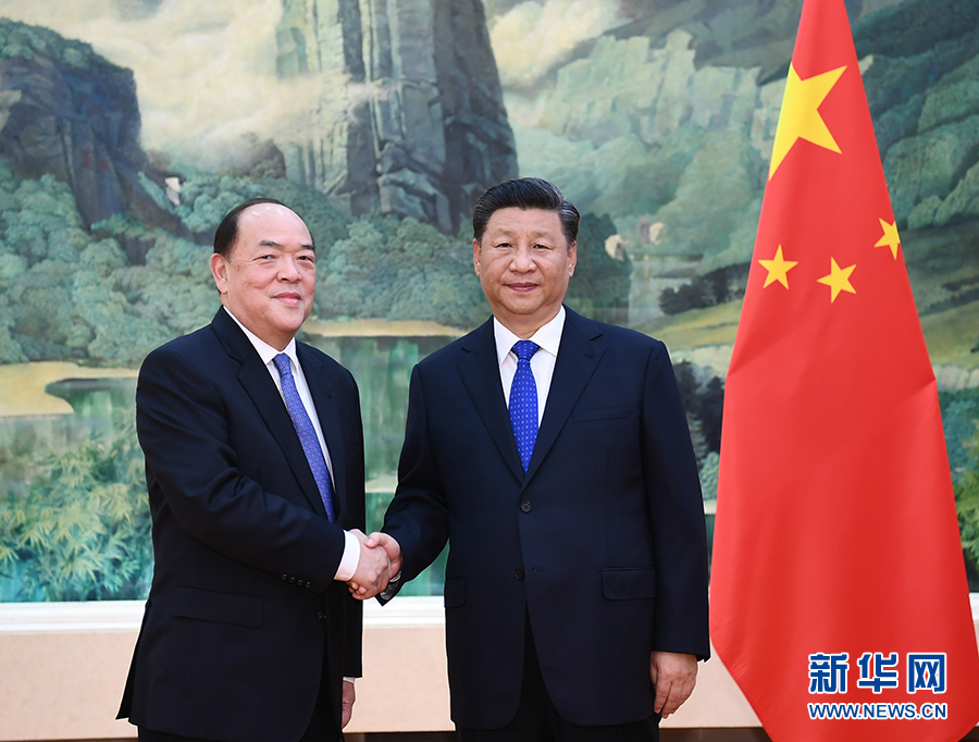 9月11日,國家主席習(xí)近平在人民大會堂會見新當(dāng)選并獲中央政府任命的澳門特別行政區(qū)第五任行政長官賀一誠。 新華社記者 謝環(huán)馳 攝