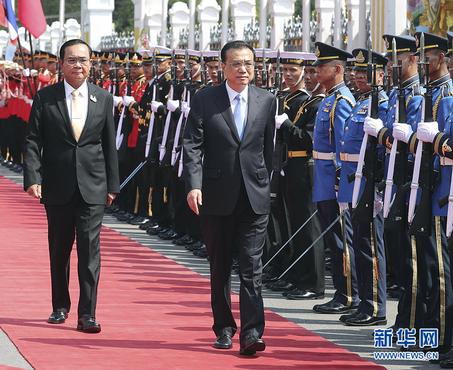 會談前,巴育在總理府前廣場為李克強(qiáng)舉行隆重歡迎儀式。兩國總理登上檢閱臺,軍樂隊高奏中泰兩國國歌。李克強(qiáng)在巴育陪同下檢閱了儀仗隊。
