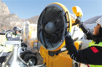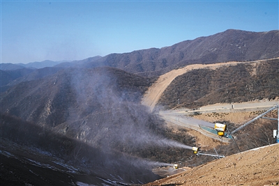 黃白相間的造雪機(jī)噴射出美麗的水霧,在空中迅速凝結(jié)為雪。圖片/北京市重大項(xiàng)目辦提供