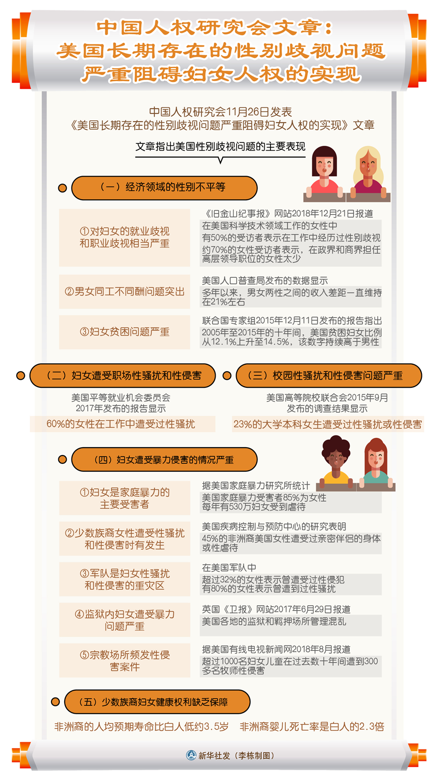 新華社北京11月26日電 中國(guó)人權(quán)研究會(huì)26日發(fā)表《美國(guó)長(zhǎng)期存在的性別歧視問(wèn)題嚴(yán)重阻礙婦女人權(quán)的實(shí)現(xiàn)》文章。全文如下: