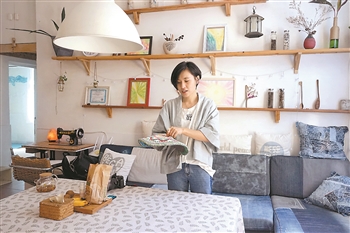在趙靜的指點下,記者找到了屋子里不少的“秘密”:舊的牛仔褲經過裁剪、縫制,成為讓破沙發(fā)煥然一新的沙發(fā)套;撿來的木板稍加處理做成了層層疊疊的廚房置物架;木衣架是用粗大的樹枝充當?shù)?,廢棄的門把手則成了很好用的掛鉤……
