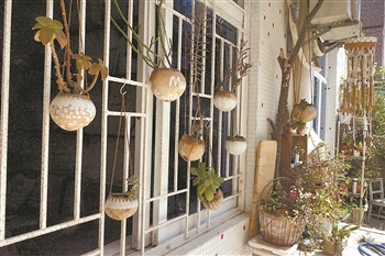 趙靜家窗戶上掛著的花盆是用椰子殼做成的。記者 劉友婷 攝