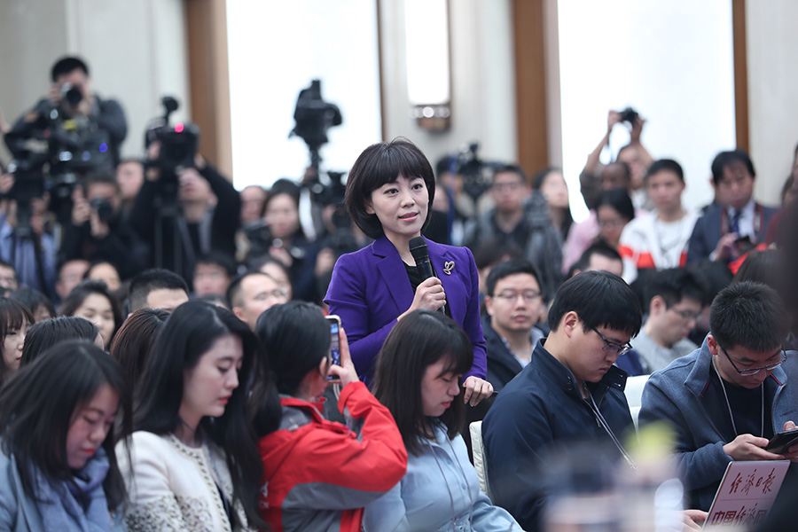 十三屆全國(guó)人大二次會(huì)議3月4日上午11時(shí)15分在人民大會(huì)堂新聞發(fā)布廳舉行新聞發(fā)布會(huì),由大會(huì)發(fā)言人就大會(huì)議程和人大工作相關(guān)的問題回答中外記者提問。圖為中央廣播電視總臺(tái)央視記者提問。新華網(wǎng)/中國(guó)政府網(wǎng) 陳杰 攝