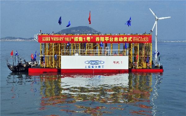 ??? 2018年10月26日上午,全國首創(chuàng)的深遠(yuǎn)海機械化養(yǎng)殖平臺“振鮑1號”在連江縣苔菉鎮(zhèn)東洛島海域下水啟用。新華網(wǎng)發(fā)(鄭帥 攝)