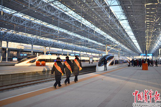 12月30日,北京至張家口高速鐵路開通運(yùn)營,京張高鐵設(shè)計時速350公里,全線設(shè)北京北、清河、沙河(不辦理客運(yùn))、昌平、八達(dá)嶺長城、東花園北、懷來、下花園北、宣化北、張家口10座車站。京張高鐵是我國首條智能化高速鐵路,也是2022年冬奧會的“門戶工程”。北京北站站臺,三名站務(wù)人員走向一輛即將發(fā)車的京張高鐵列車。 實(shí)習(xí)生 宋欣然/攝