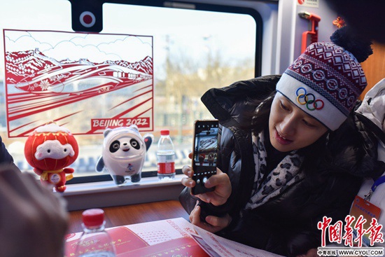 一名乘客正在拍攝2022年北京冬奧會吉祥物和車窗上的窗花。這些剪紙窗花是由張家口蔚縣剪紙藝人創(chuàng)作,包含了詹天佑畫像、京張高鐵和冰雪運(yùn)動等元素。實(shí)習(xí)生 宋欣然/攝