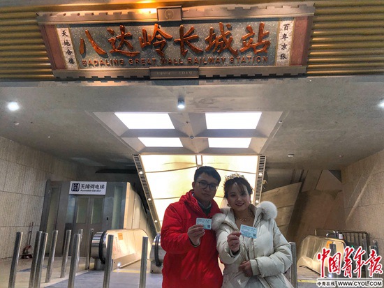 最后檢查完八達(dá)嶺長城站的防撞條、電梯等細(xì)節(jié)后,手機(jī)屏幕的時鐘跳到了深夜1點(diǎn),32歲的胡維急忙趕回不遠(yuǎn)處的員工宿舍。那里,妻子肖雅萍正在屋里試婚紗。