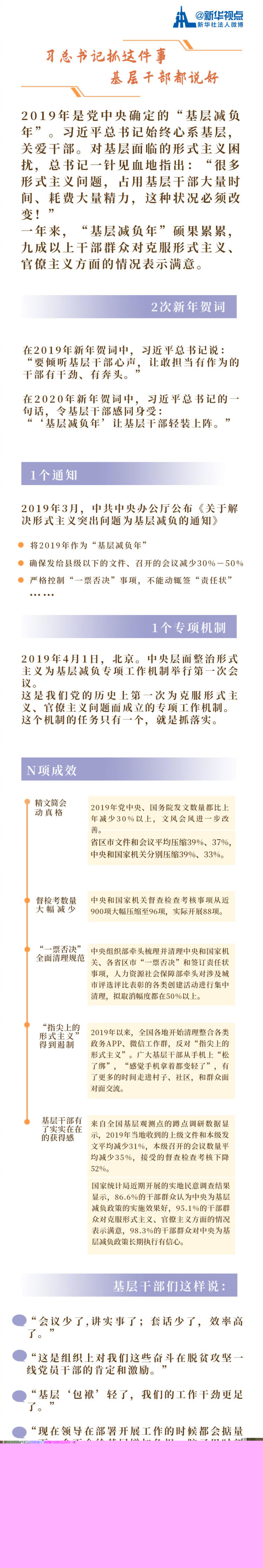 將2019年作為“基層減負(fù)年”,確保發(fā)給縣級(jí)以下的文件、召開的會(huì)議減少30%-50%,嚴(yán)格控制“一票否決”事項(xiàng),不能動(dòng)輒簽“責(zé)任狀”……切中時(shí)弊、直擊“痛點(diǎn)”的舉措,讓廣大基層干部備受鼓舞。