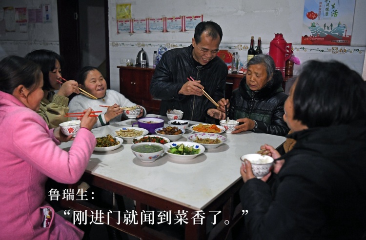 女兒和親戚們把老魯夫妻扶進(jìn)了家門,80歲的老母親把飯菜又熱了一遍,一家人終于坐到了飯桌前……