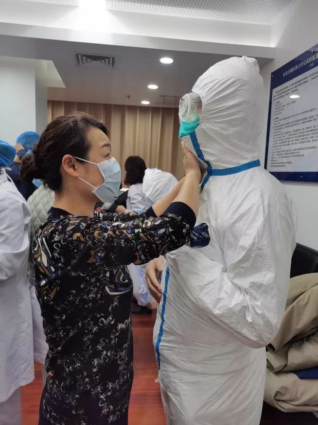 ?。▓D說:出發(fā)前,首都醫(yī)科大學(xué)宣武醫(yī)院在全員培訓(xùn)的基礎(chǔ)上,對(duì)醫(yī)護(hù)人員進(jìn)行穿脫防護(hù)服等感染防控加強(qiáng)培訓(xùn)。在現(xiàn)場,首都醫(yī)科大學(xué)宣武醫(yī)院呼吸科副主任醫(yī)師肖漢(右),他的愛人北京醫(yī)院醫(yī)務(wù)處副處長潘琪(左)正在用自己的專業(yè)知識(shí),幫助丈夫規(guī)范穿戴防護(hù)服。)