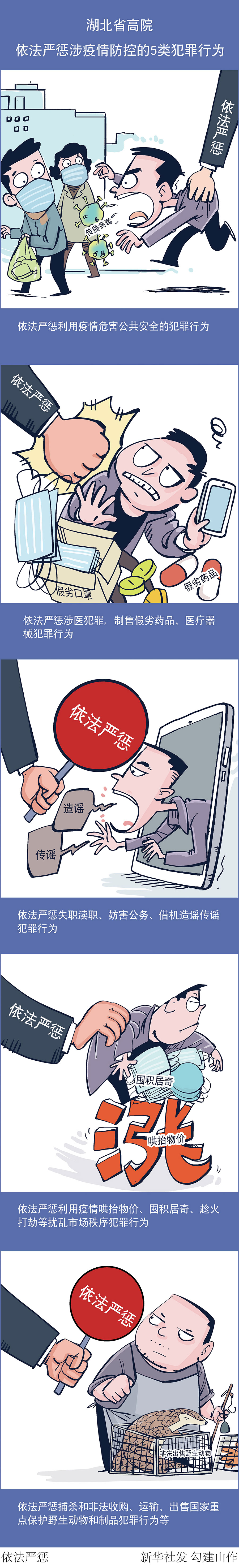 新華社武漢2月5日電(記者梁建強(qiáng))記者5日從湖北省高級(jí)人民法院獲悉,湖北省高院已制訂下發(fā)《關(guān)于充分發(fā)揮審判職能為新型冠狀病毒感染的肺炎疫情防控提供司法保障和服務(wù)的意見(jiàn)》,要求各級(jí)法院認(rèn)真落實(shí)黨中央、國(guó)務(wù)院、最高人民法院和湖北省委、省政府關(guān)于疫情防控相關(guān)決策部署,充分發(fā)揮審判職能作用,切實(shí)維護(hù)社會(huì)穩(wěn)定,保護(hù)廣大人民群眾的生命健康安全和合法權(quán)益。其中,明確了5類(lèi)將依法嚴(yán)懲的刑事犯罪類(lèi)型。