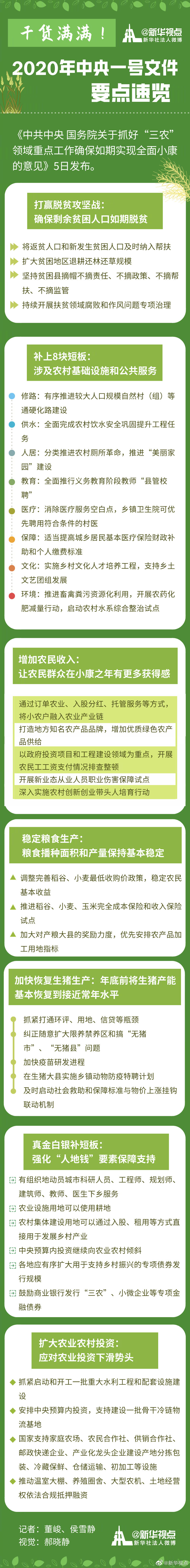 《中共中央 國務(wù)院關(guān)于抓好“三農(nóng)”領(lǐng)域重點(diǎn)工作確保如期實(shí)現(xiàn)全面小康的意見》5日發(fā)布。針對集中力量完成打贏脫貧攻堅(jiān)戰(zhàn)和補(bǔ)上全面小康“三農(nóng)”領(lǐng)域突出短板這兩大重點(diǎn)任務(wù),文件有哪些干貨、硬貨? ?