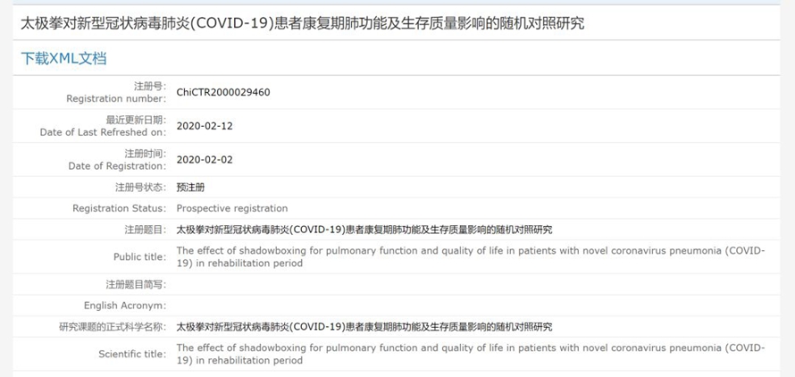 近日,記者用“新型冠狀病毒肺炎”等關(guān)鍵詞,在中國臨床試驗(yàn)注冊中心查詢發(fā)現(xiàn),截至2月12日已有60項(xiàng)符合檢索條件的試驗(yàn)。這些臨床試驗(yàn)內(nèi)容非常廣泛,既包括多種西藥、干細(xì)胞、中藥、重要注射劑,還包括社區(qū)干預(yù)療法等。令記者沒想到的是,其中竟然還有一項(xiàng)預(yù)注冊方案,準(zhǔn)備研究太極拳對患者康復(fù)期肺功能及生存質(zhì)量的影響。