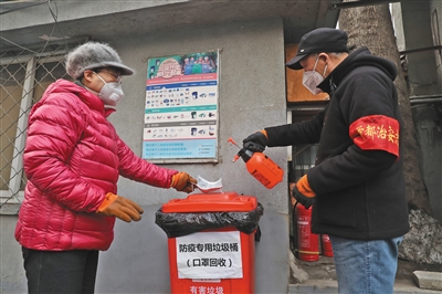 2月13日,新街口街道大乘巷教師宿舍院垃圾分類指導(dǎo)員對(duì)居民投放的口罩進(jìn)行初步消毒。記者 王飛