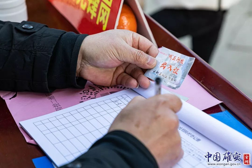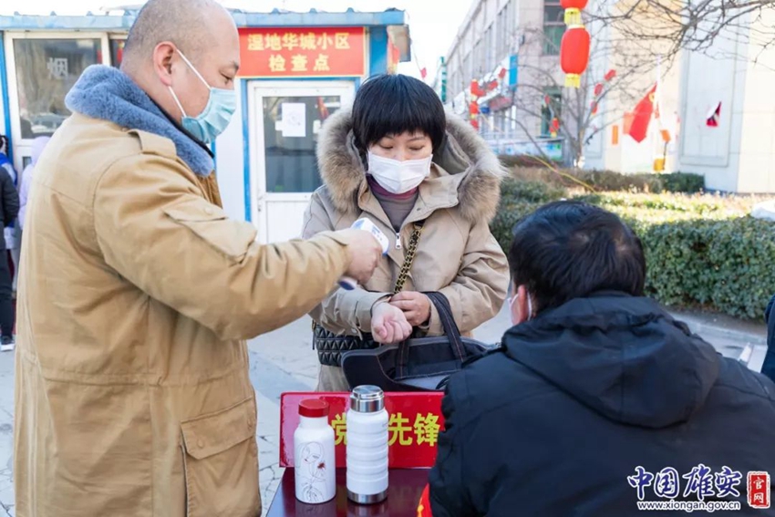 疫情防控工作人員為濕地華城小區(qū)住戶辦理出入證。中國(guó)雄安官網(wǎng)記者毛鶴然 攝
