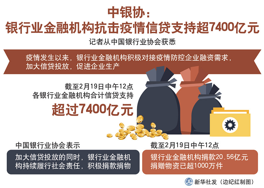 新華社北京2月20日電(記者李延霞)記者從中國銀行業(yè)協(xié)會獲悉,疫情發(fā)生以來,銀行業(yè)金融機構(gòu)積極對接疫情防控企業(yè)融資需求,加大信貸投放,促進(jìn)企業(yè)生產(chǎn)。截至2月19日中午12點,各銀行業(yè)金融機構(gòu)合計信貸支持超過7400億元。