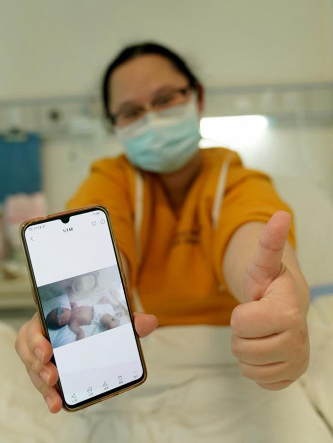 2月18日,楊女士展示手機中自己兒子的照片。在武漢華中科技大學同濟醫(yī)院中法新城院區(qū)新冠肺炎重癥病區(qū)住院的楊女士是武漢人,在身患新冠肺炎后剖腹產(chǎn)下一名男嬰。嬰兒目前在醫(yī)院進行隔離觀察,但各項指標均正常。當楊女士知道孩子的情況后,懸著的心終于放下。在醫(yī)護人員的努力下,她的病情也有了好轉。新華社記者王毓國 攝