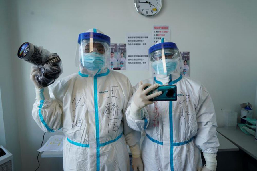 2月18日,新華社記者王毓國(左)、許楊在華中科技大學同濟醫(yī)院中法新城院區(qū)準備進入隔離病房內采訪。新華社記者 余國慶 攝