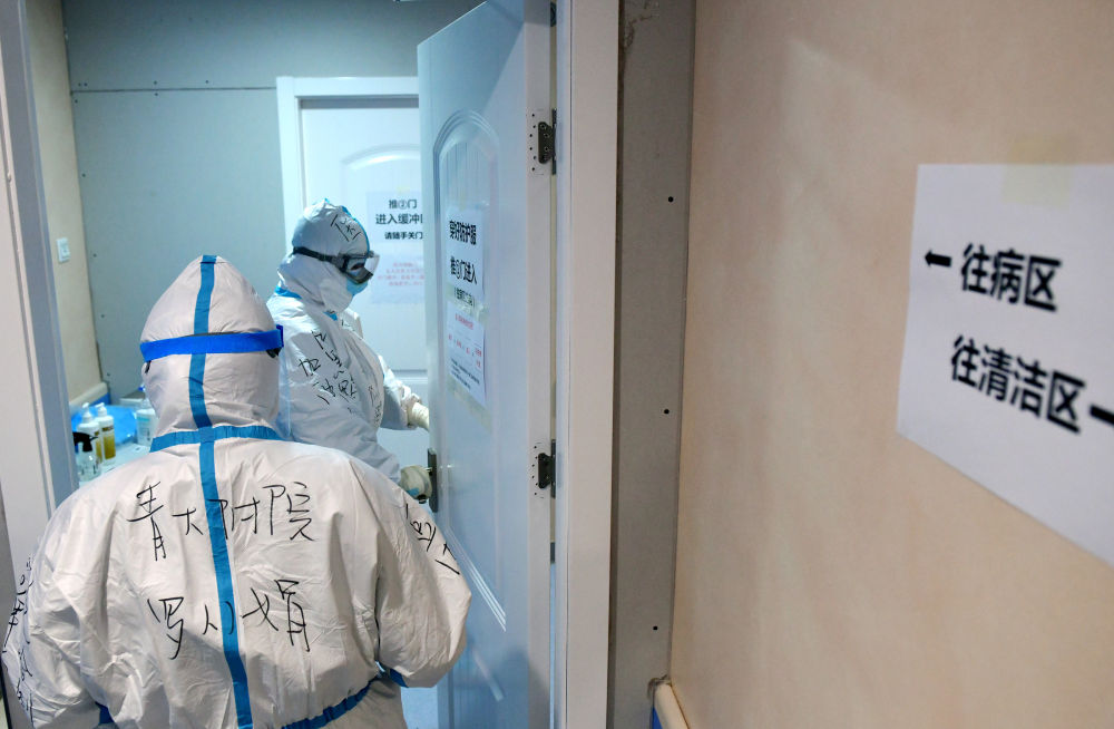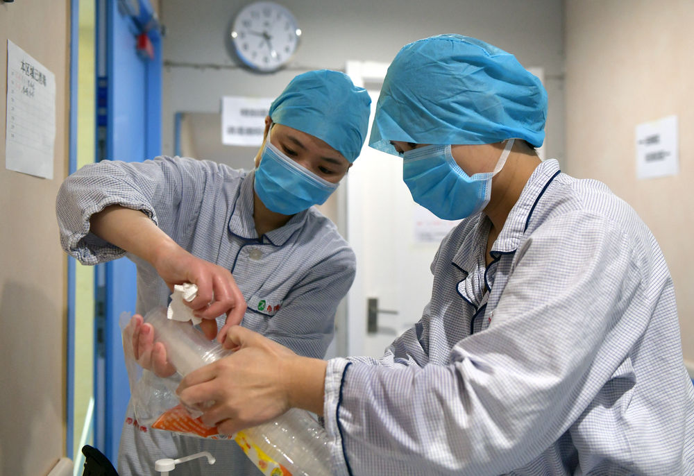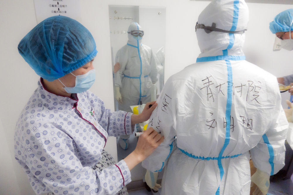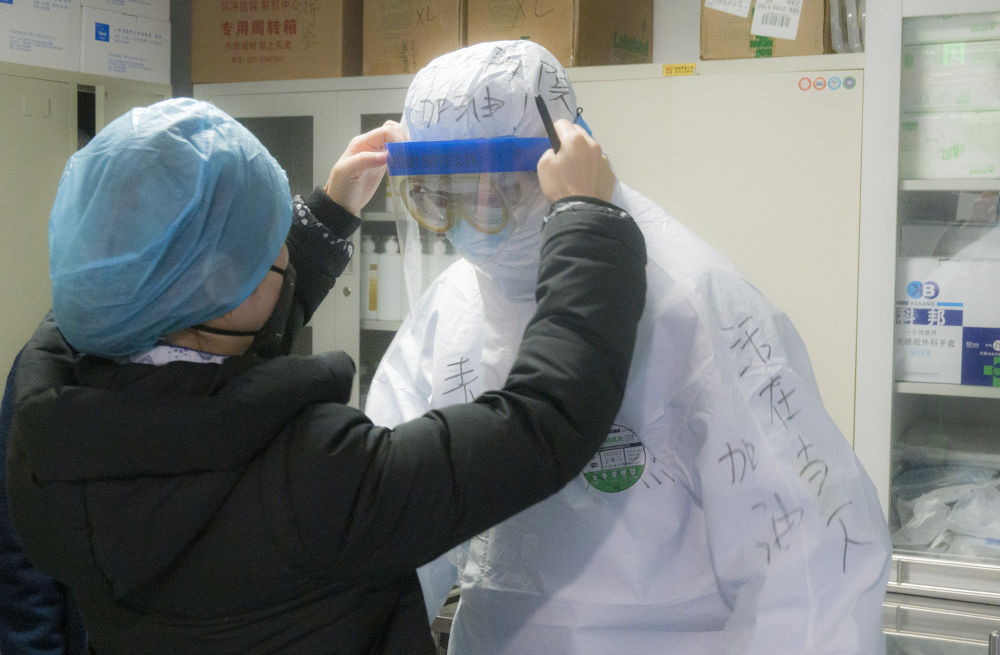 在武漢同濟(jì)醫(yī)院光谷院區(qū),一名青島大學(xué)附屬醫(yī)院醫(yī)療隊醫(yī)護(hù)人員為同事佩戴面罩。