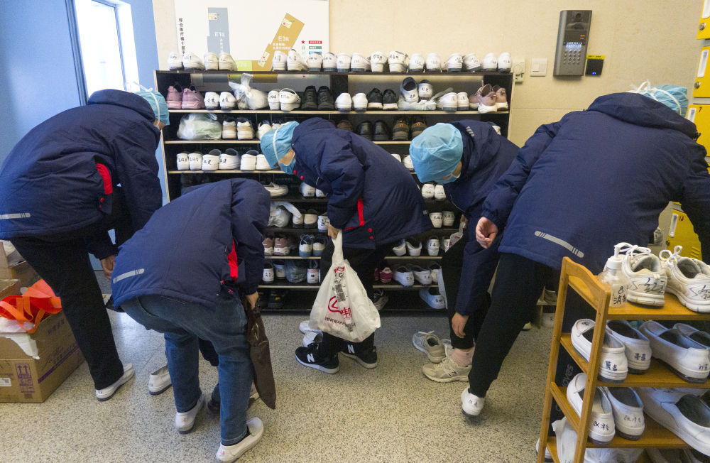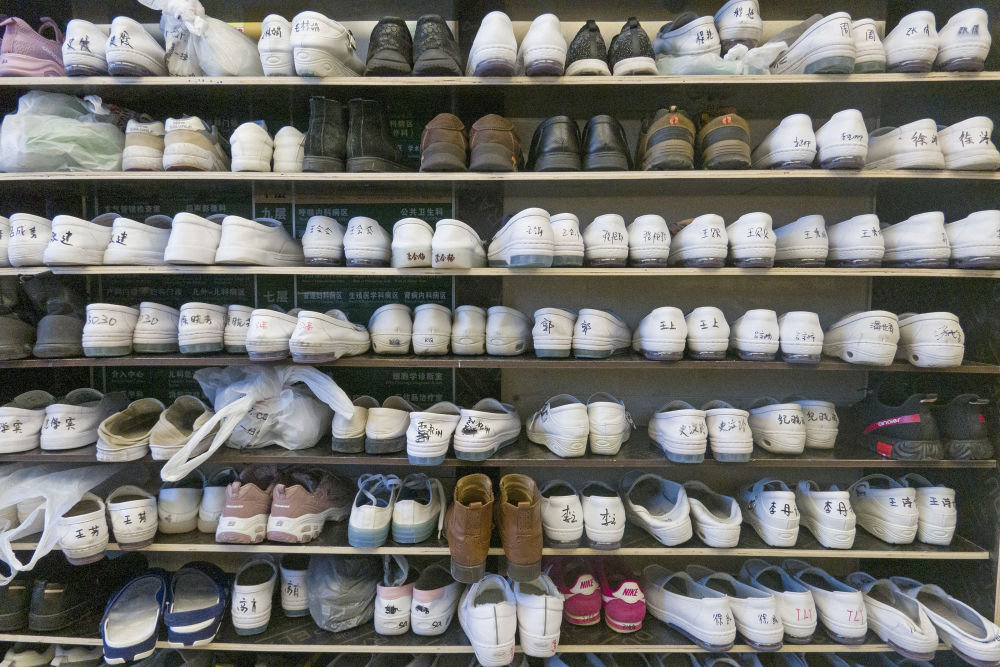 醫(yī)務(wù)人員按規(guī)定將鞋整齊有序地擺放在工作間外。